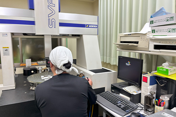 製品の寸法・位置・形状などを測定する装置として広く使用されているのが三次元測定機です。極めて精密に測定することができ、高品質な製品を製造しご提供するために欠かせない機器です。製品の角度や形状精度なども測定が可能。その値によって製品精度を評価できることから、加工工程中においても品質を維持するために使用しています。